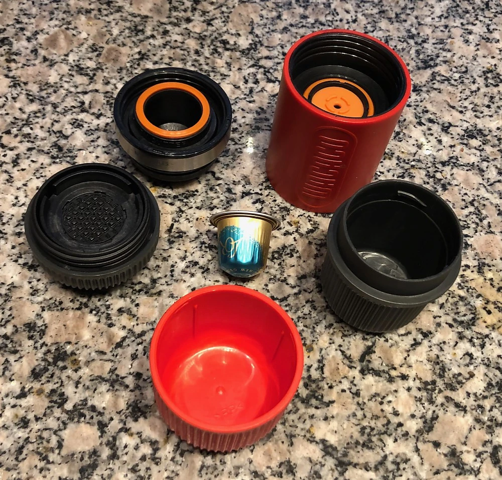 Nanopresso, built-in espresso cup, filter basket, scoop, brush, multi-languages instruction book, warranty card